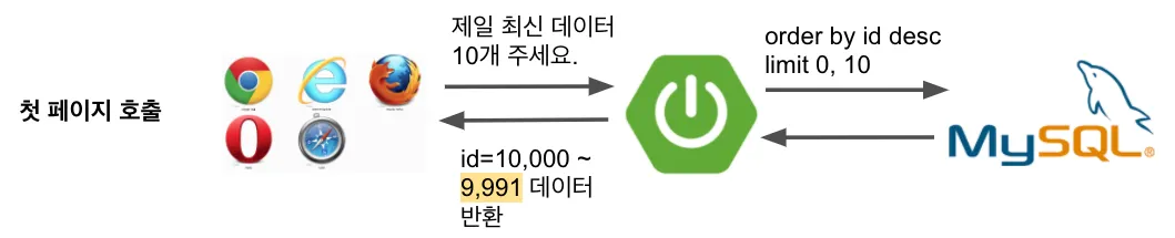 이전에 조회된 결과를 한번에 건너뛸수 있게 마지막 조회 결과의 ID를 조건문에 사용하는 것으로 이는 매번 이전 페이지 전체를 건너 뛸 수 있음을 의미한다. no offset을 사용하게 되면, 아래와 같은 형태로 구현이 된다.